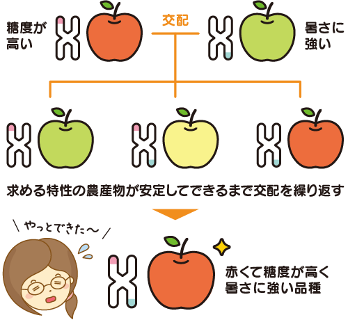 必ずしも目的通りの特性を持つ農産物ができるとは限らないため、長い年月や労力がかかる