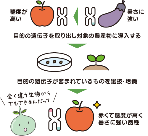 ある生物の持つ「良い性質の遺伝子」を取り出して、別の生物の遺伝子に組み込むことで、その生物に新しい性質を持たせる技術のことです。
