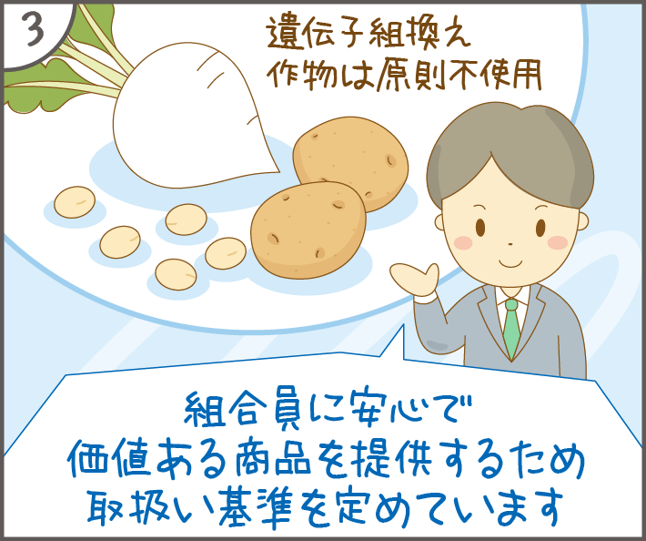 遺伝子組換え作物の安全性は私たちが普段食べているものと比較して審査しています。また審査を受けていない作物やそれらを使用した食品は法律により流通・販売が禁止されています。