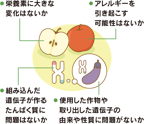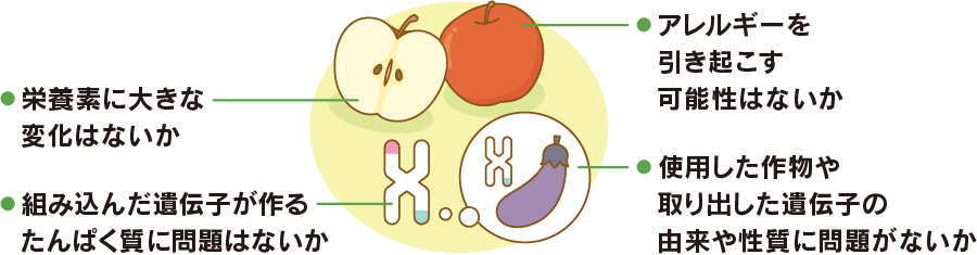 遺伝子組換え作物の安全性は私たちが普段食べているものと比較して審査しています。また審査を受けていない作物やそれらを使用した食品は法律により流通・販売が禁止されています。