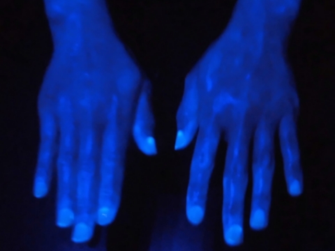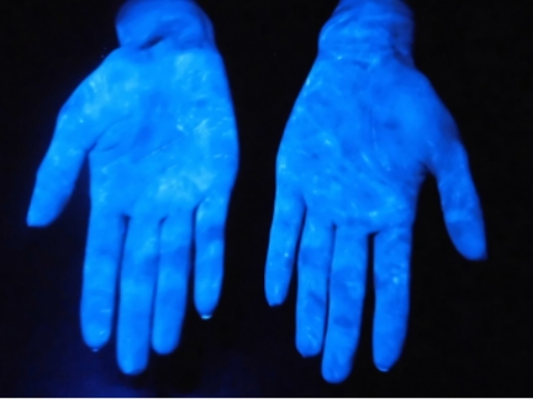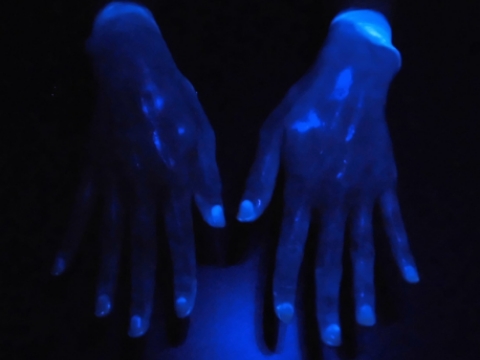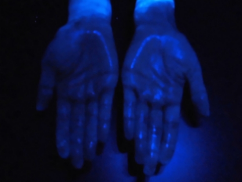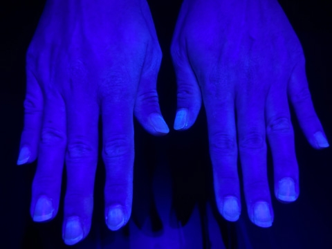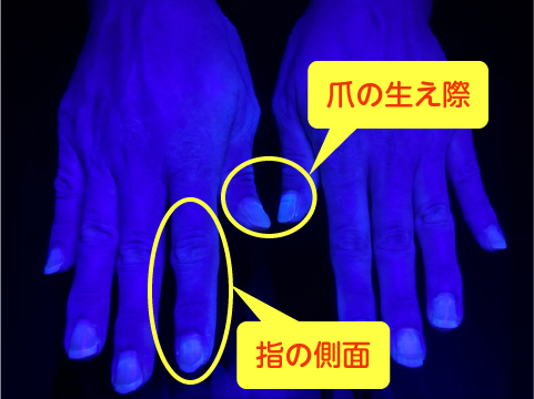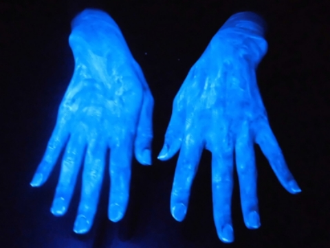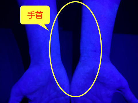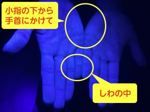 蛍光ローションを塗った手にこのライトを当てると・・・