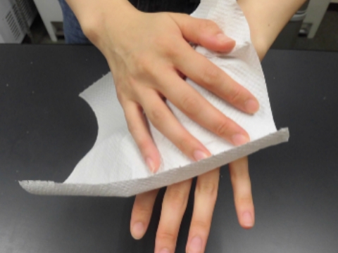 流水で十分にすすぎ、ペーパータオルでしっかり手を拭く