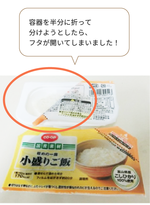 二つ折りで小分けできるタイプの容器は、手でひねるように力を入れて分けようとすると要注意です。