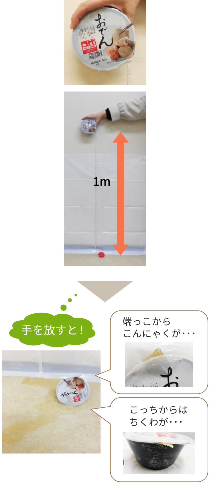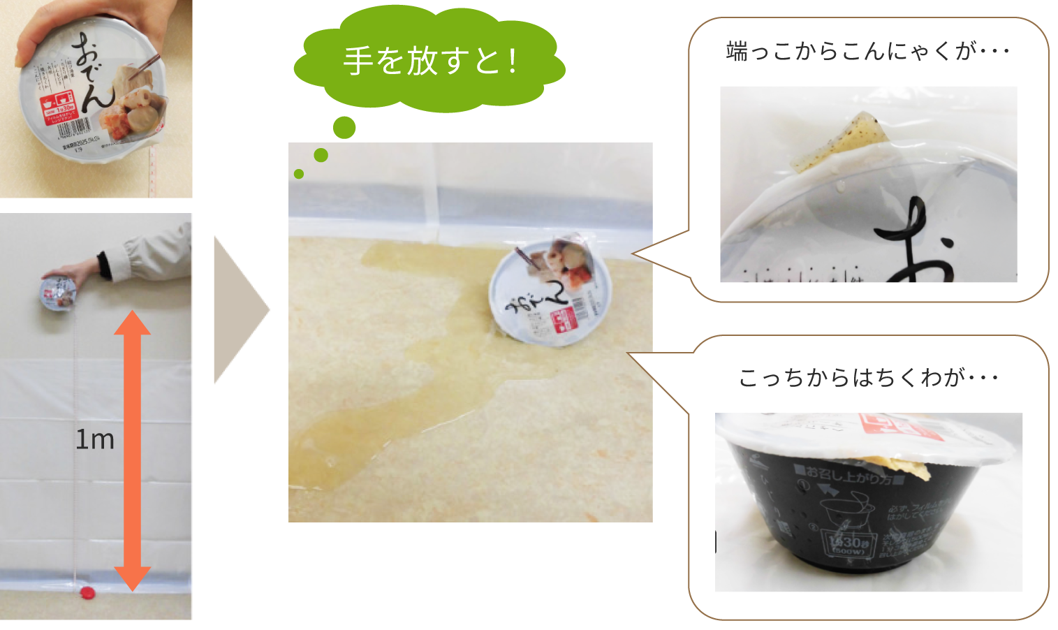 レトルトパックのおでんを1mの高さから容器を縦にして落下させて、容器に穴があくかを確認します。